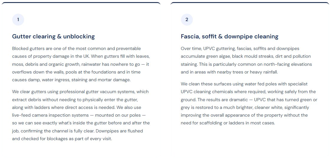 We offer two distinct but complementary services both together and separately: gutter clearing — removing blockages, debris, moss and organic growth from inside the gutters and down pipes — and gutter, fascia & soffit cleaning, which restores the exterior surfaces of your guttering areas to a much brighter, cleaner appearance.
