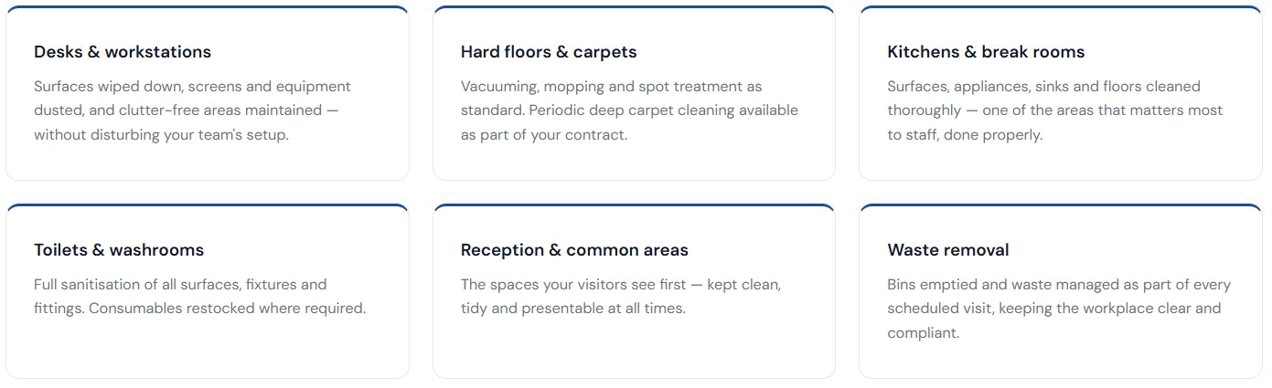 Our teams are experienced across a range of commercial environments — from small business premises and serviced offices through to large open-plan workspaces, managed buildings and business parks. We focus on doing the job consistently well, visit after visit.